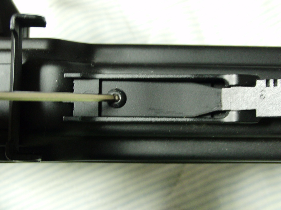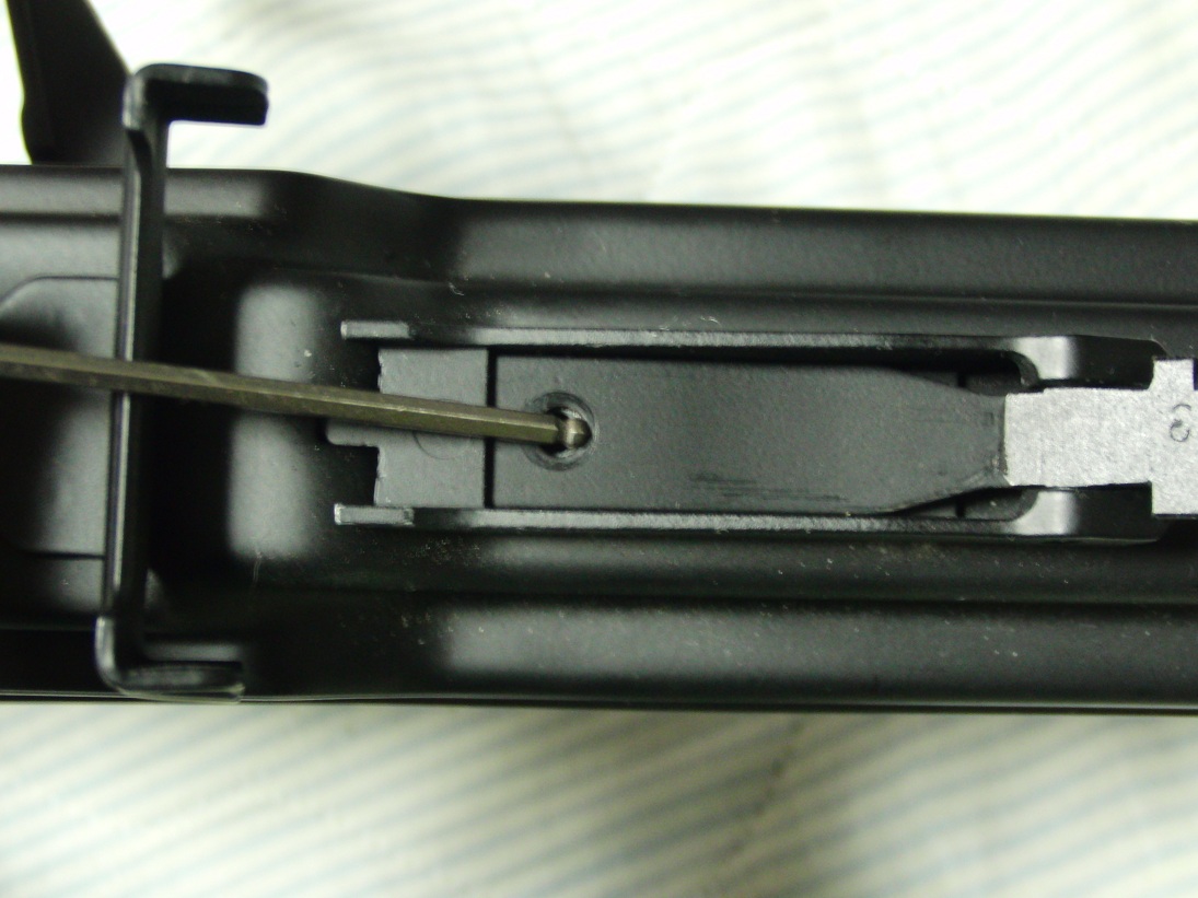 次にストックのもう一本のネジオイラー近くの六角とフロントサイト調整工具を取り外します。