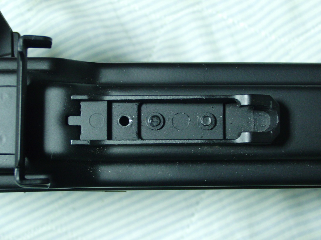 一つはチャージングハンドルのレールの中、もうひとつはフィードアームカバー後方です。